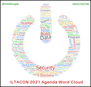 I know the hype, anticipation as well as apprehension surrounding ILTACON this year is high so not having major expectations might be the best M.O. Regardless, one thing is certain, the conference content, delivered via nearly 90 in-person and virtual sessions, will be high caliber and provide many opportunities to learn, share ideas and trade war stories. A brief look at the session ‘areas of focus’ provides a preview of what ILTA members are looking for: 8 sessions are focused on Corporate; 7 on Litigation Support; 6 on Security; 6 on KM; 5 on Marketing as well as numerous sessions on AI, O365, Legal Process Improvement, Leadership and Data Science. You can also check out InsideLegal’s word cloud from the ILTACON 2021 session grid here.