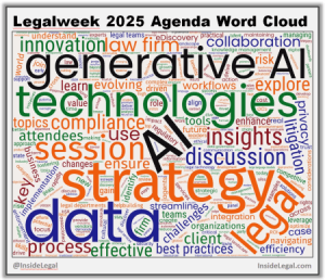 Monday marks the beginning of Legalweek 2025 in New York City. Legalweek, still known to many of us as LegalTech NY, will allow attendees the opportunity to “explore emerging trends, spotlight the latest tech, and offer a roadmap through the industry’s seismic shifts.” We’ve taken the conference program content — 100+ educational sessions, spanning 35 topical tracks, presented by 300+ speakers, curated for the 6,000+ advertised attendees, and produced a visual word cloud. As many reading this probably remember, InsideLegal has created word clouds for many previous LegalTech/Legalweek editions. Remember when this was an eDiscovery show?!